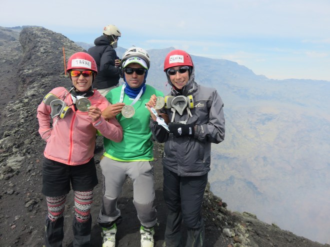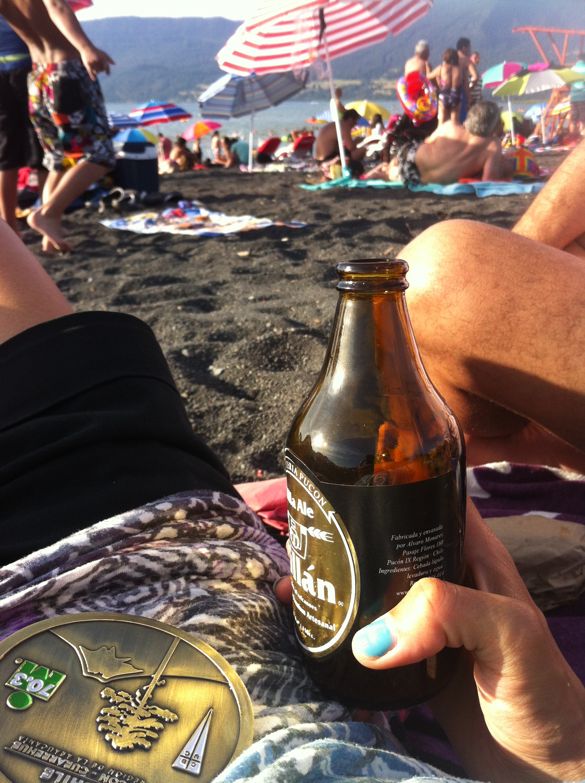 I originally wanted to finish my first 70.3 in 5 hours but with only 3 months of training really and on a tough course (from what I heard) plus I saw the times from previous years and knew under 6 was excellent in Pucón. I know I can do it much faster and now that I know how it is I´m not as scared. In the end I felt it was almost too easy. I finished and my legs were fine (a hem after a massage). It was better than finishing a marathon for sure. I had stiff hamstrings after but the massage relieved that and all was good. In fact the next day I climbed the Volcan Villarrica, something I had wanted to do last time but the trip got cancelled due to wind, so I was super happy I could do it this trip. I think all Ironman racers from Pucón should finish at the top of the volcano the next day. Then it would start with a swim in Lake Villarrica and finish climbing on Volcan Villarrica, sounds good no? ha ha says the loca 😛 I will say after the race I was pretty tired but I still stayed up pretty late and chilled on the beach with my medal, a beer, and a piece of cake in the evening. 😀