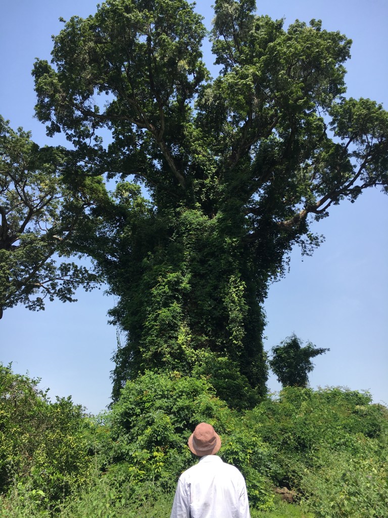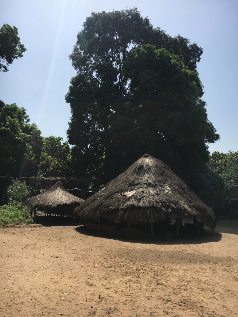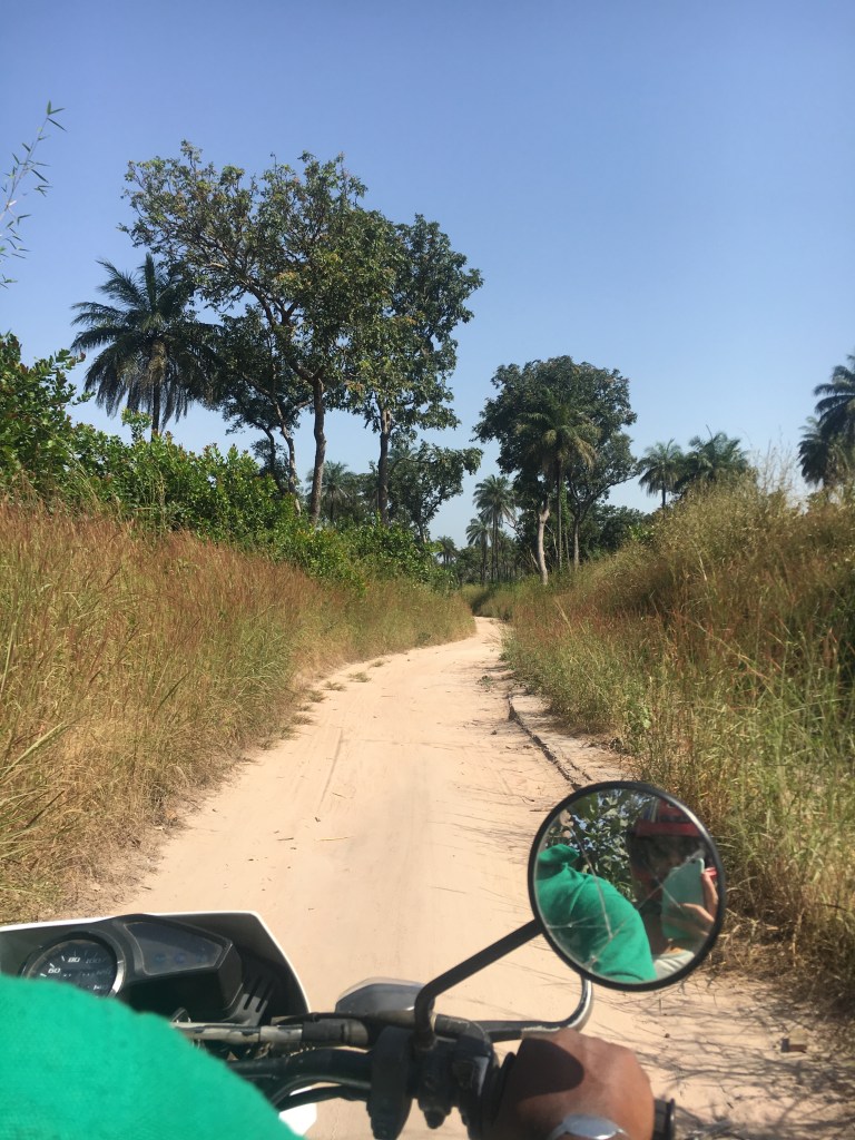 Once back to the houses we were informed that the Mato Sagrado couldn’t be visited by women 😦 nooo… all this effort to learn now (2 hours on bike to get there + 1 hour walk) lol. He did point them out to us…they were trees…I was not expecting this but the trees were huge and beautiful in the sunlight…the palm tree with a bench was for the women and the huge tree covered in vines was for men, we were allowed to the entrance where you saw just the benches. He was kind enough to explain a bit, they don’t use the mato sagrado a lot just for ceremonies and everyone contributes money to buy the stuff needed…drinks and food, etc. The park ranger wasn’t allowed in either because besides being a man one needed to be part of the religion (have had a ceremony of initiation) to enter. At the responsables house there were wooden motifs of men half buried in the ground, in this case there were 3, each represented a member of his family who were the previous responsable for the ‘mato sagrado’. We didn’t waste more of his time so we said bye and we headed to the next village on our way back. We found a group of men chatting under a tree there and they welcomed us, we exchanged names and I found out which was the responsable here. He was the most talkative one but he would not show us the mato nor point it out. We just weren’t allowed. I walked around the village of 4 houses and talked to the kids but found little evidence except the house of the responsable with the same statues…this time just one representing his father. I wanted to try another town but the ranger said it would be the same, they were very cautious and protective about the mato and it is likely we wouldn’t see anything and waste more time so I agreed to just head back…besides I’d just be looking at trees anyway ha ha. Interesting trip out there and my first of many encounters with this type of religion as I travel in Africa…it spread from here to Casamance…next door literally plus many parts of Africa had nomadic people and only recently divided into separate countries (still many more in Africa are yet to divide).
