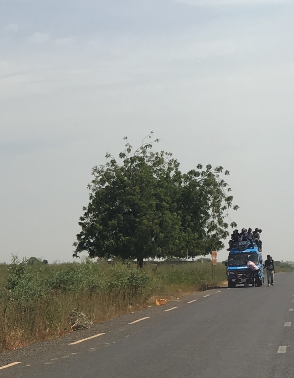 Next I headed to a small town called Kuntaur, where I planned to visit the African stone circles and see chimpanzees! The place was along the Gambia River so I expected a chill atmosphere…it was indeed ha ha. I caught a morning van that way and watched how more and more people were crammed in along the 2-3 hour ride…more crammed in than I found in Senegal or Guinea…all sitting….worse seats were those closest to door…I was in the back…a tad better (1st place – don’t pronounce the ‘E’ – aka passanger seat was also great, just one person). There were I think 17 people inside most the time. I was dropped at the Georgetown river crossing as they continued toward (another atm over there). I took the small boat across since the ferry wasn’t crossing yet…same thing lots of people (all sitting) and a motorbike :). Once over I waited for the van to fill…which basically happened once the ferry crossed 40 minutes later..ha. Once we were off, this van equally as packed, It was an hour maybe to the town, which I didn’t make it to because I saw on the map a closer road and since the van had stopped I jumped out too and began walking….I was luckily picked up by a pickup truck heading the same direction. Yeah, Finally in town!