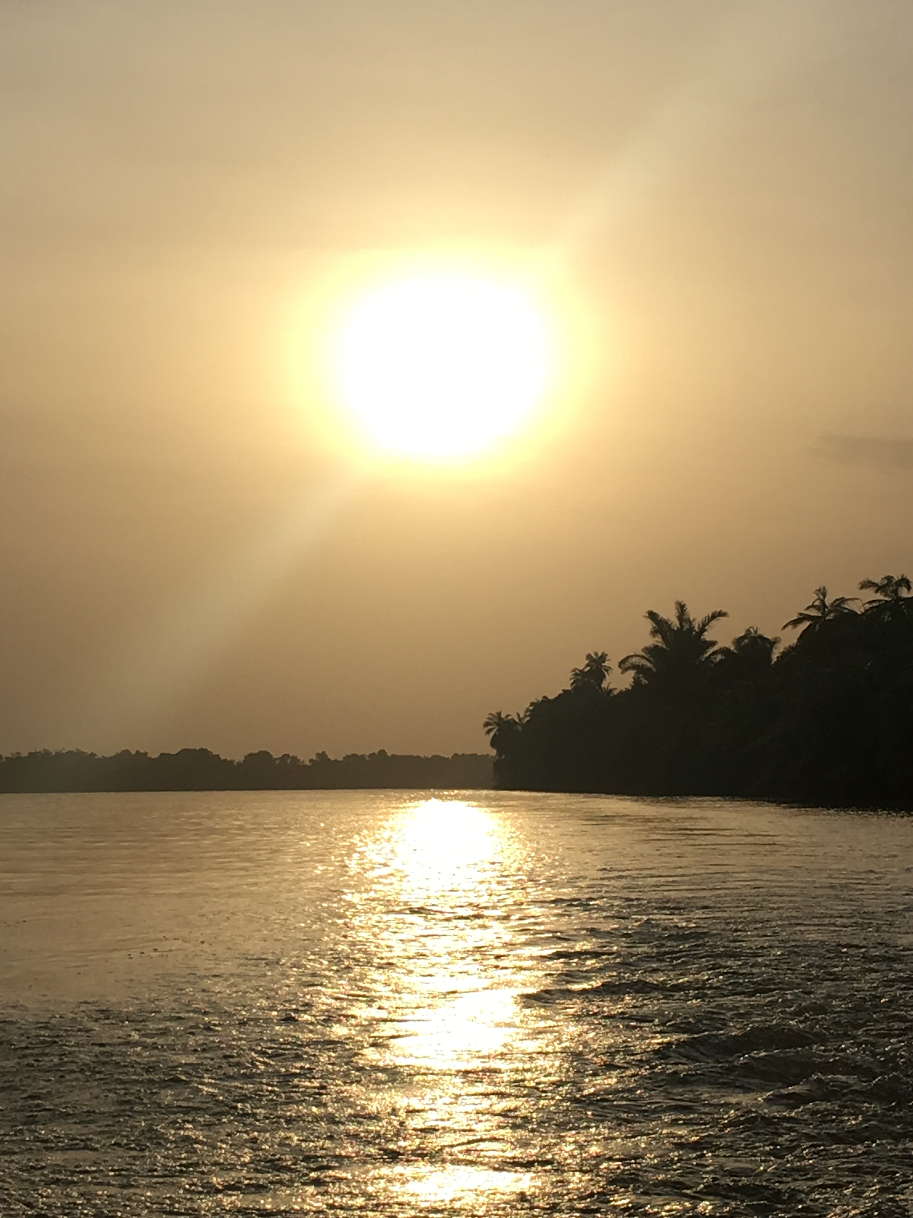 So luckily that first day at the hotel a group was staying and doing the tour to see chimpanzees and I could join them. The monkeys are on several islands…in the river…really like a huge zoo…there are 127 chimpanzees (Gambia River NP). It was a project started to protect them…many were brought from labs from all over Africa…some are originally from The Gambia but because they are on the island they can’t escape…they don’t swim…Besides this fact I say it is like a zoo because they are also fed nightly (even though there is enough food on the islands) so the rangers can make sure they are well and just check on them…they all have names and are recognized easily by the rangers. No humans go on the islands (so they say) but sometimes in their feedings they get medicine, antibiotics or birth control, soo it is highly regulated…despite this control it might be the best zoo ever for them where elsewhere the bush is burned, vegetation depleted and animals forced out. The chimpanzees expect the feedings and perch on branches along the river…some alone, others in groups of 2-4 so of course this is good for tourists too. I saw them yes but it seems a tad controversial and I’m not sure this counts as seeing them in the wild…might have to go to East Africa again in search. Besides chimpanzees there are other monkeys (which the boat captain could care less to stop for…) on the island but no predators for them…in the river you can see Hippos and crocs too…didn’t see the crocs but the hippos quite a few. It was my second time viewing them and I enjoyed see them in the river spouting water as they came up for air…also in the evening from the hotel you could hear them doing this too! Evenings were very magical here along the river…darkness filled with stars, firefly lights, hippo splashes in the unknown distance, flashes of birds going home and random fishermen setting nets for the night (loved it!).