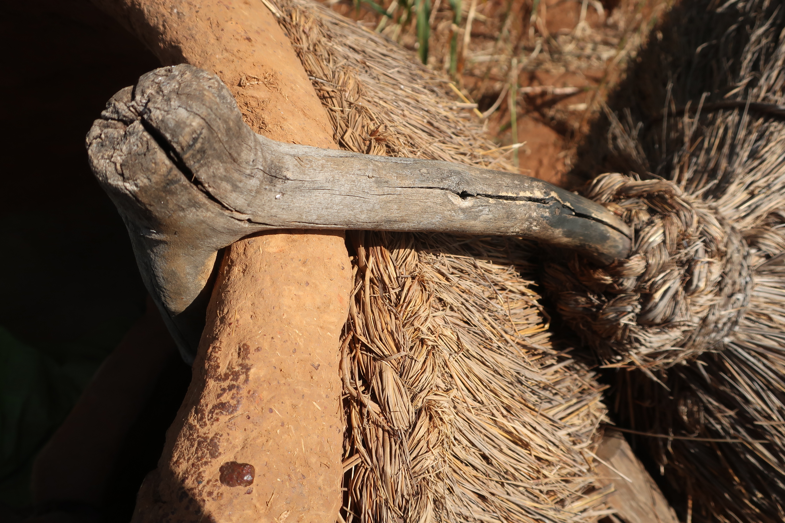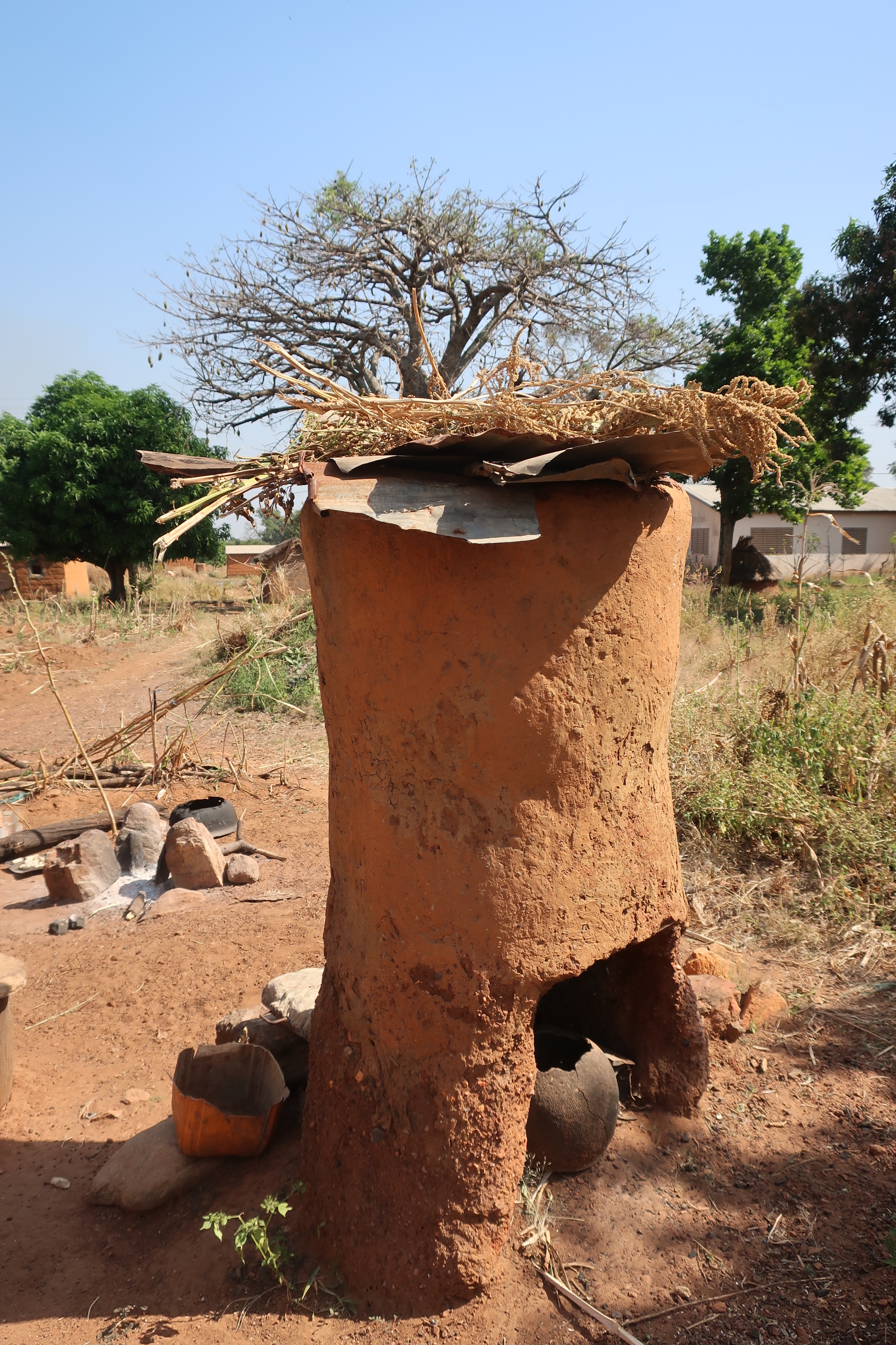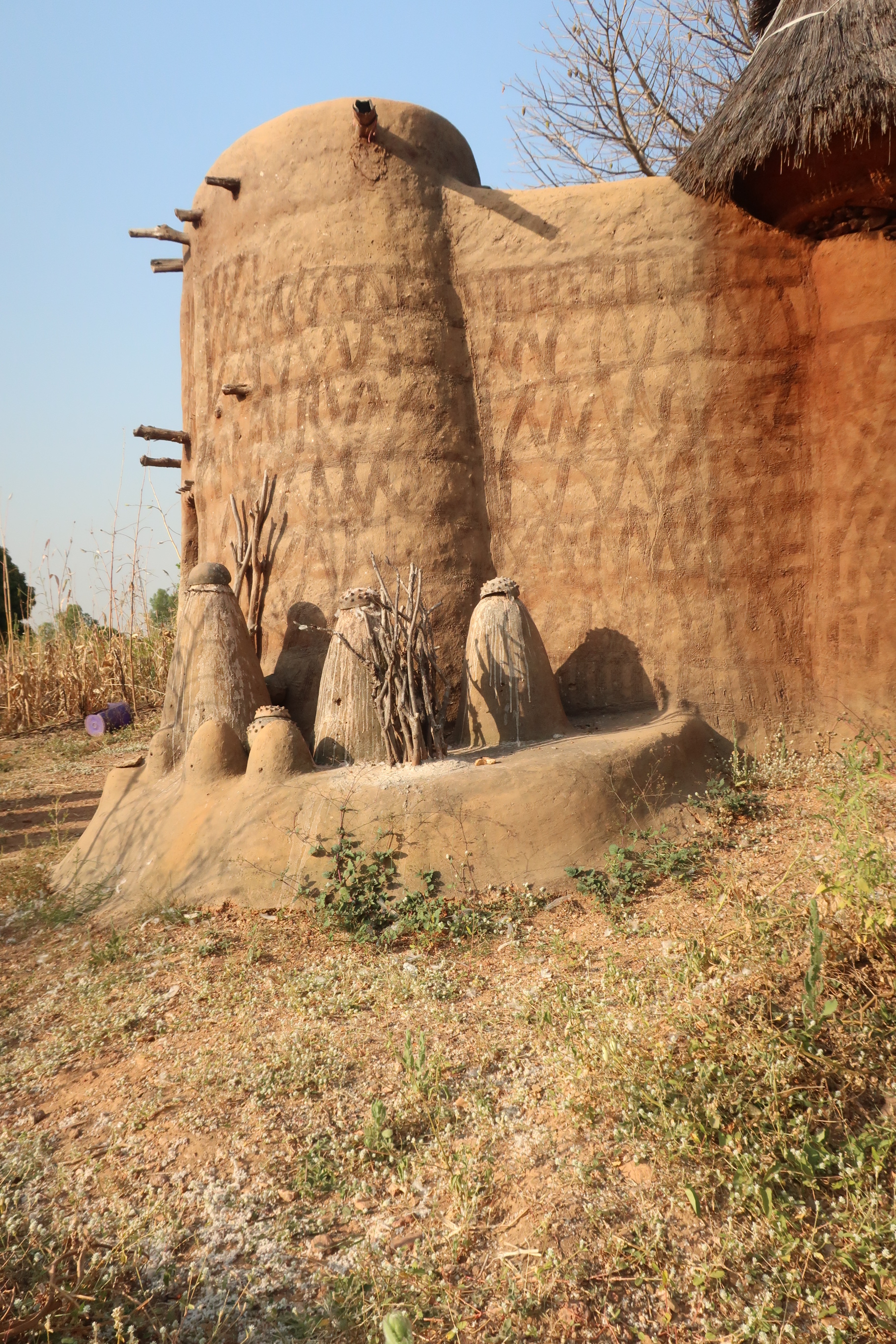 Homes have two floors, some fine patterns on the outside (matching their facial markings it seemed – which are done at a young age – 3yo – to show what tribe they pertain), voodoo relics near the entrance and about 6 towers (of differing sizes). On the first floor you find the kitchen and area for farm animals. Here I found it particularly interesting that there were some wooden beams termite treated with smoke from the stove…which made them last longer. To get from the first floor to the next there are some stairs and a ladder. On the roof you have the sleeping areas, grainery/storage area, another cooking area and plant drying area. Mainly they sleep directly on the open air roof because it is hot but if needed (if it rains) they have space to sleep under several of the towers. The homes do have a drainage system as well which in turn helps them shower and clean stuff. The construction of the home is done by a special Somba architect and takes about 4-5 months to gather all supplies and physically construct the homes…in the end they can last up to 20 years although modern design and ease are starting to change everything….(abandoning traditional homes for a newer style). The main jobs in these communities are of agriculture, hunting and butchering.