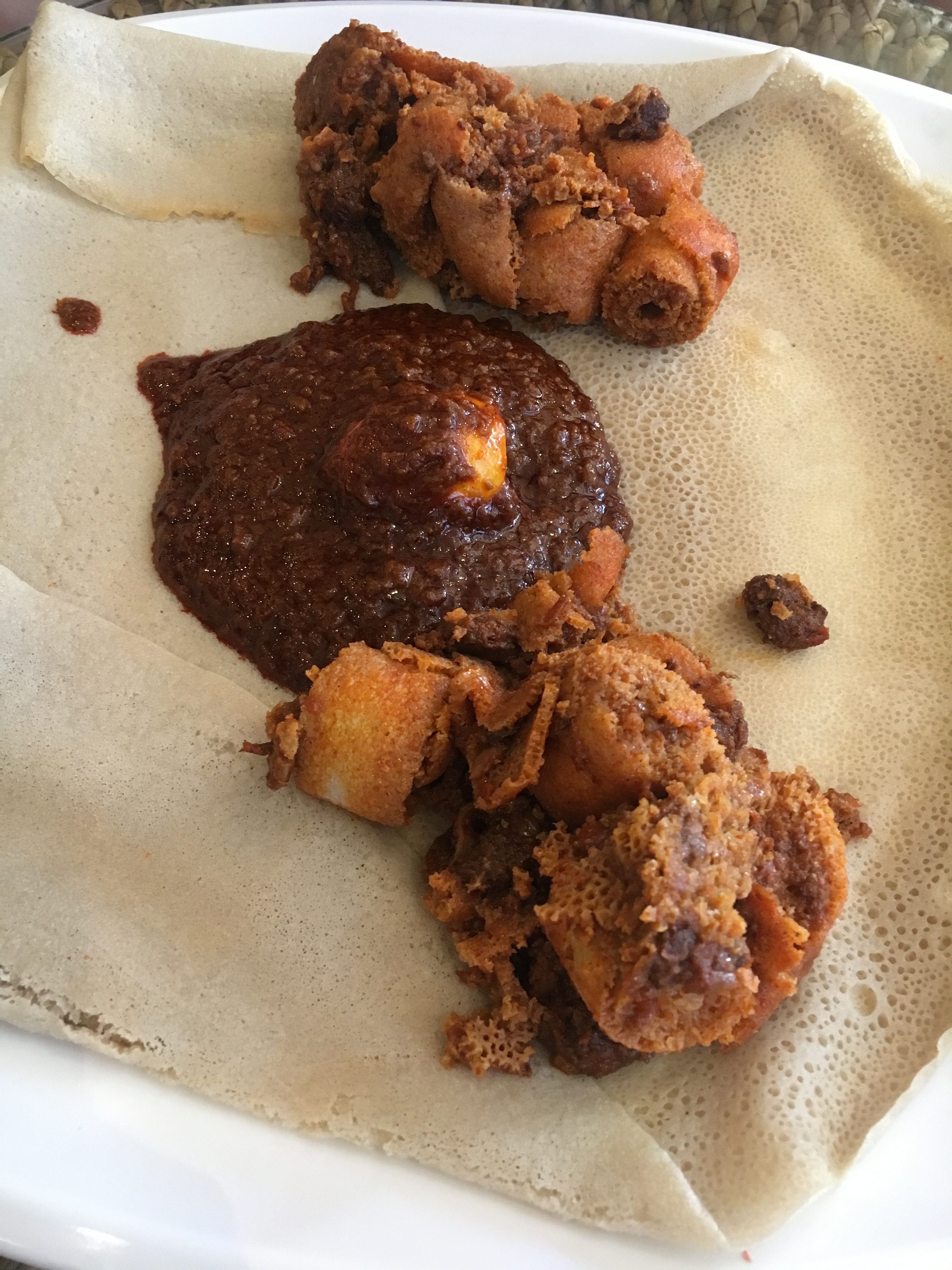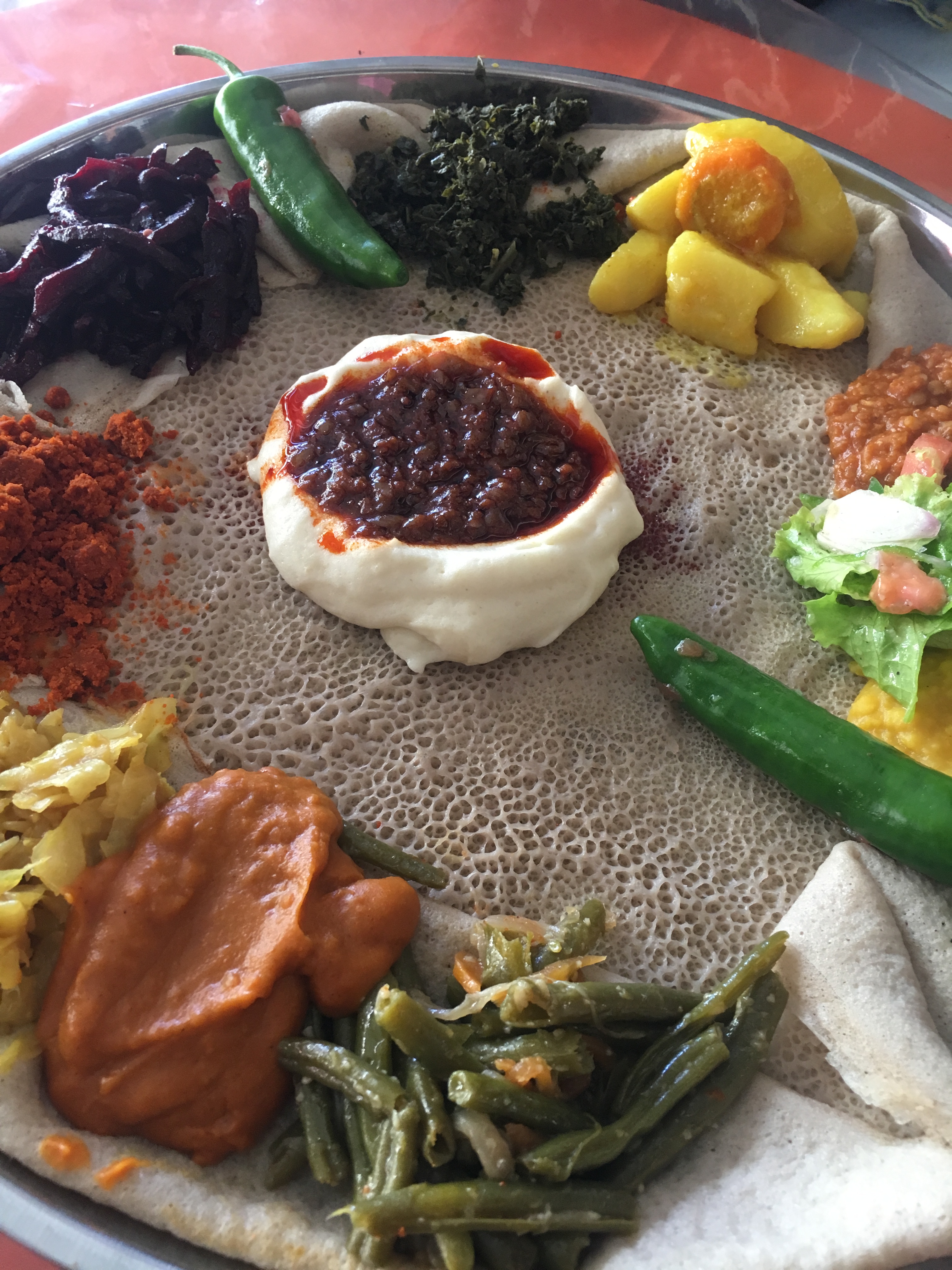 Onwards…one of the main reasons I was attracted to visit Ethiopia was actually for the food. I love Ethiopian food and it was amazing to finally be there and try so many different dishes. Imagine a huge very thin pancake that is grayish or very light brown that has been heated just long enough for the bubbles to make holes in it and it stays that way. Well it kind of looks like this but unlike a pancake it´s served cold, tastes a little bitter and is called injera. This injera is made of teff, a small grain grown everywhere there, especially in the highlands, and is full of protein and calcium….sooo good for you! Each dish has warm food on top of it, like meat, lentils, vegetables or just a simple thick sauce. Culturally it´s placed on a huge plate (usually way too big for the plate) to be shared with others and eaten by hand. You tear a piece of the injera (pancake thing) and pick up some of the food or sauce on top and stuff it into your mouth (sometimes someone else at your table feeds you). Locals eat it rather fast. I savored each one and took my sweet way too slow time. Another cultural thing to note is that Ethiopians (the majority) are Ethiopian Orthodox Christians and fast a good chunk of the year. Unlike other religions this doesn´t mean they don´t eat but instead fasting means no meat (plus other things not related to food that the body desires). They fast every Wednesday and Friday and then 55 days for Lent (Easter) and some 43 days for Advent (Christmas)…even then there are a few other celebrations when they are fasting…Totaling a whooping 252/365 days a year (minimum 180) of fasting! This I believe is the longest fasting time of a religion in the world..ha if eating can be included! In Islam, for example, they fast during Ramadan, only eating when the sun is absent during a whole month.