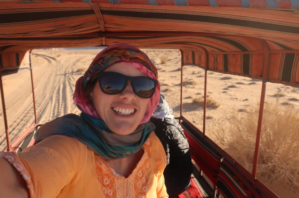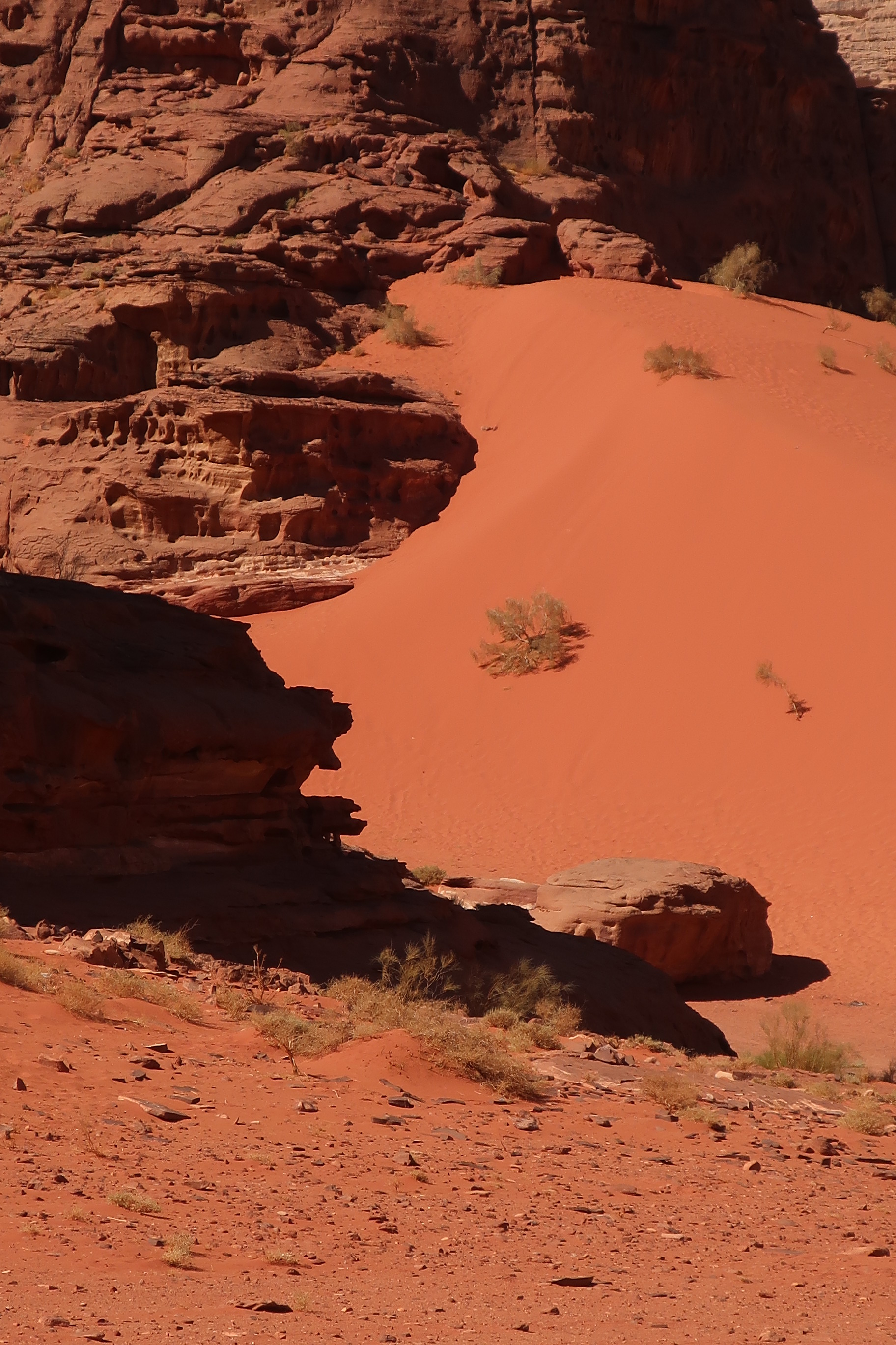 Our guide through Rum Stars was great. He spoke plenty of English and every day he would stop somewhere and make us lunch and take a tea break. Days were busy and long. I started each day with a run exploring on my own. I was surprised how easy it was to run on the sand…as long as you were away from vehicle tracks and dunes. I never saw animals but looked hard and enjoyed finding tracks everywhere. Then it was shower, breakfast and off to the day´s planned activities. Day one was all in the truck stopping at the sights; rock bridges, odd shaped rocks, petroglyphs, etc. Day two was hiking. Day three was camel ride for 4 hours. My first time riding one in the desert! It was cool until everything ached (took a few days to feel less sore). Three hours is probably the max I´ll ever do again and the sunrise version looked amazing. Stopping often definitely helped rest the bum and legs. It was worse then riding a horse because your legs are so far spread out. Watching how the camel folds down to sit with it´s limbs folded upon themselves was entertainment every time. They are big, loved eating bushes even while walking, were kind of cute and I am glad we never ran on them. Days ended in the hut, around a fire, usually with an enthralling discussion of Bedouin life or travel…with some tea of course.