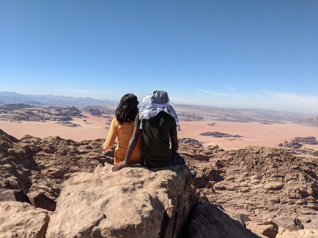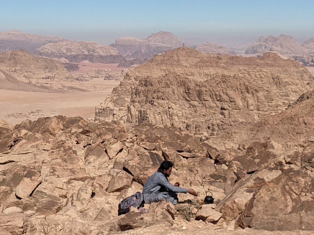 The hike in the desert was wonderful too. Tea at the top was a lovely treat. Can you tell that tea (coffee too) is important in Jordan? The guide gathered some dried branches and collected a local sage, carried it up to the top of the second highest peak in Jordan (Jabal Al-Hash) and made us tea from his kettle. It was great to be so high up as it put before us a different perspective of the desert and the vastness of its mountains. We could actually see Saudi Arabia from where we were and Jordan´s highest peak right before the invisible but highly guarded Saudi border line. It was very enjoyable at the top with some desert flowers between the rocks, a light breeze, great visibility and just five people in total. There were plenty of tourists traveling in Jordan no worries but you could definitely find peaceful spots throughout. In truth it is no where near like it used to be as we sat daily, max 10 people, in a huge dining hall meant for 60 tourists. According to the Bedouins, November marked the return of tourism, before that there were even fewer visitors due to covid. Most visitors were Europeans on holiday and it was incredibly rare to find someone from America…in fact everyone was surprised when we mentioned we were from there. The Bedouins, typically nomadic camel and goat herders, have created a town at the entrance to the desert to live and make it easy for tourists to find them. It is sort of their adaptation to modern society. About 20% of the community still lives deep in the desert full time but a good chunk are now found in town making money through tourism or camel raising and camel racing.