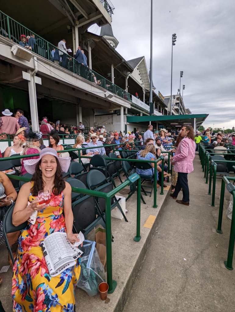 Derby was on Saturday, May 7, 2022 and we dressed up again. This time a notch down on fancy since the infield dress code changes a bit. Instead of attending the races in the grand stands you have a whole mini city where you can play around. You are on the grass infield meaning you may encounter mud although there are paved areas too. You can bring chairs, blankets and some items in a clear plastic bag, such as water and snacks. People attending infield for Derby were varied but I did see an abundance of college students in this area and in general people wanting the experience or in person viewing without all the cost or expected fashion. This also tends to be the party area where in the past drunk people ran across the tops of the port-o-potty´s or climbed the flag pole. The good news is that you can always get infield tickets day of if you decide to go last minute (prices do increase but are accessible around $70). By the way, if you are single, know that Derby week in general seemed to be a great place to mingle.
