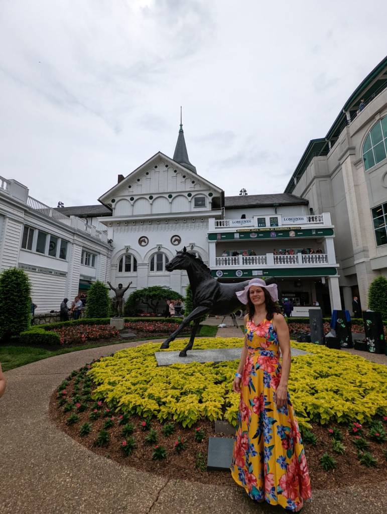 Of the five day trip we found ourselves at the Churchill Downs almost daily while in town. Wednesday, Thursday and Saturday we were at Churchill Downs for various events. The actually Kentucky Derby has run consistently for 148 years in May, usually the first Saturday in May, since 1875 (exceptions: 2020, Sept. 5; 1945, June 9; 1901, April 29). On Thursday we attended the local version of the Derby, called Thurby and Wednesday was museum and tour of Churchill Downs. Had we gone Friday the races held would be the Oaks which is pretty much Derby but instead of 3 year old male horses (called colt) it is the 3 year old female horses (called filly) for Friday´s race. Most horses retire at 5 years old so at 3 years old they are basically at their prime and around 5 years they usually retire on the ranch or become a stud. Friday and Saturday are when most attend and often are a package deal online. Derby is called a run for the roses while Oaks is lilies for the fillies…simply named because the winning horse of the main race on these day gets draped with their respective garland of either lilies or roses after. Sunday was Mother´s Day and had it not fallen the day after the Derby this year they normally offer a brunch with races and special treatment for the mom´s, which locals told me is great!