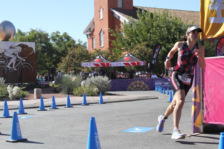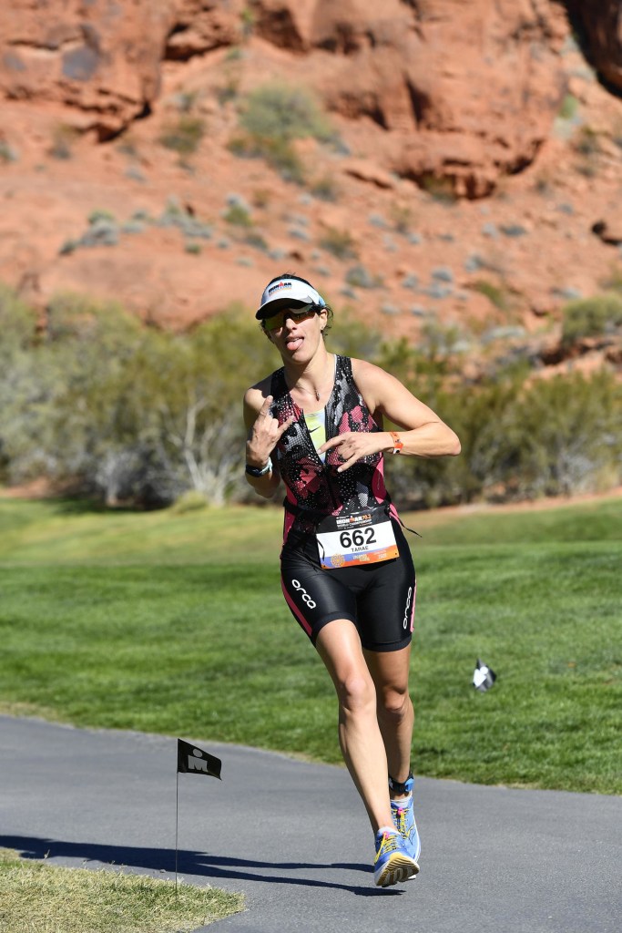 Besides that news the whole course was up and down hills from one state park to another back into town. The Snow Canyon State Park we went through toward the end I am positive all athletes will recall forever because it was 10km (6 miles) of a never ending hill though one entrance and out another. This was the most beautiful part of the ride and we were all going slow enough to take in the mix of wavy red rock along with plants, white rocks and even some red sand! Everyone wanted the grind up that hill to end…I had no clue how long it was but was pushing to pass as many athletes as I could because I knew once we were out it was a long solid downhill to the transition area. That ride down was definitely sweet, cruising around 30 mph at least! I did take that time on the downhill to eat some more, hydrate and apply sunscreen so I could zoom out of the transition and into the run.