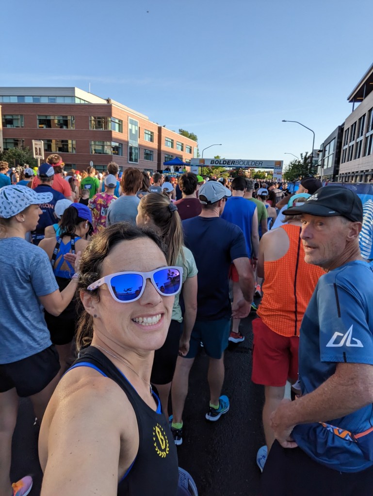 Bolder Boulder (BB) has an intense wave system…it spans 3 hours and has like a bazillion of them! I was in one of the first but not the very first wave thankfully because that set off at 6:55….I needed those extra 5 minutes!! Given the crazy wave system (some 89 waves, 31 are qualified time waves, the rest are walk/jog waves) when I got to the start area I was amazed at how easy it was to move up to my wave….simple yet organized, everyone gave space on the side to move ahead. You had to be in your correct wave too because as we got closer I found out they had security checking bibs as your wave moved up to the startline….I guess you can be in a slower wave but not ahead. I have never seen this tactic before! Waves were separated by a rope and clearly labeled. For such a huge race, it has impeccable organization….maybe 43 years is enough to give it that…well and a rockin´ founder (Steve Bosley) paired with a renowned runner (Frank Shorter).