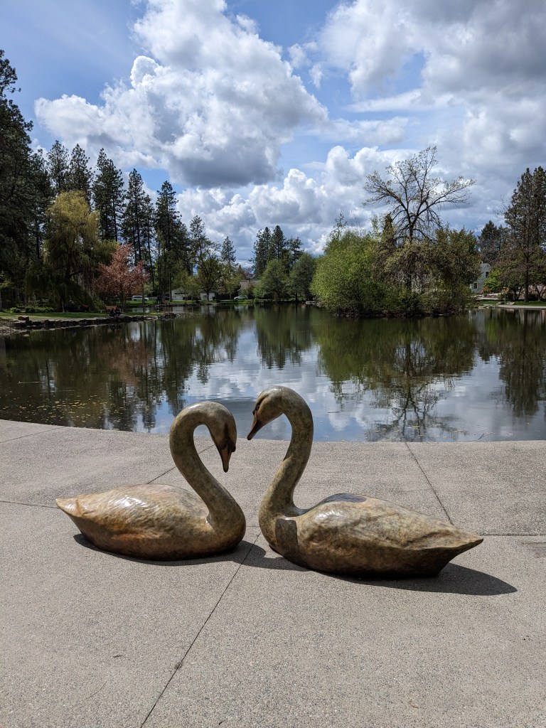Feeling better today, I headed straight into downtown to wander for a bit then followed the lake back out toward Spokane. There is a new Mudgy and Millie statue by the waterfront (or at least I didn´t see it 3 years ago, last I visited) so I spent plenty of time getting a selfie with them ha ha. Once the trail ended I popped up to catch the Centennial Trail I completely missed taking on my way into town. It follows the I-90, has rolling hills, passes a freeway rest stop and travels under plenty of pine forest. The trail in Idaho was my least favorite overall because it literally was along the I-90 most of the time plus it seemed to be the hilliest portion of the entire trail (don´t quote me here). Though the bridge crossing into Idaho was definitely my favorite.