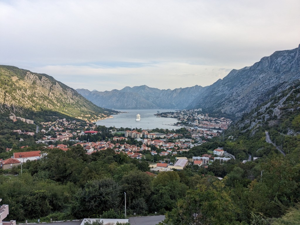 I had the whole road to myself going up the forested steep mountain. I met two Hungarians on tour and saw a few cars. Views were absolutely stunning and kept getting better and better as I pedaled up. First I saw the bay, a cruise ship was now parked in it looking silly between all the mountains and also ugly as if it was a big white skyscraper sitting in the bay. As I continued up I started to see nearly the whole bay, then the Adriatic Sea, then Croatia and probably Bosnia too since Montenegro is so tiny. I was really in disbelief at all that I could see while pedaling up that it made me laugh. I couldn’t believe all the beautiful nature revealing itself before my eyes as I ascended higher up in this tiny country! Also the fact that I had it basically all to myself…well until the top where I found a guided cycling group finishing the climb and celebrating. I cycled a bit further at the top looking for this painted red bike (which I saw on my navigation app Komoot) with a view for the classic photo opp but never found it… turns out I had to go a tad bit farther…bummer! Video of views