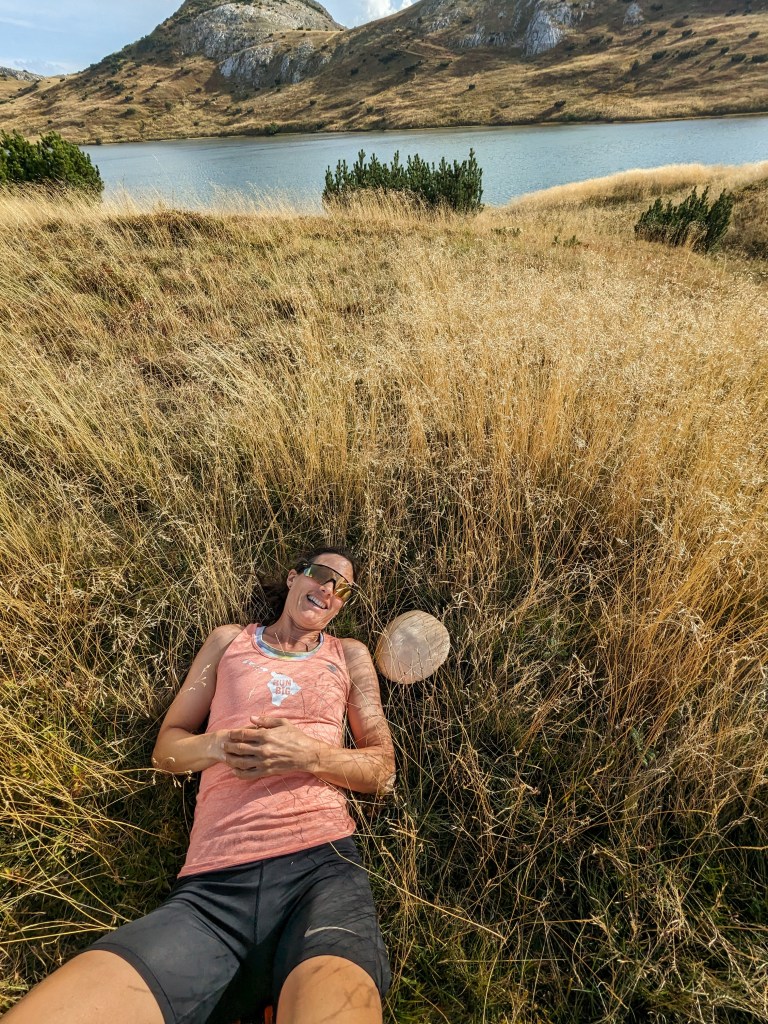 We weren´t doing a crazy hike, that there wasn’t much elevation gain and that we were headed to a lake. Most of the path was through grass and there was somewhat of a path to follow most of the way. We kept leap frogging a 2 person crew setting out markers for a trail race happening the following weekend until they finished for the day. Up and over treeless terrain filled with grasses and very white rocks with some taller mountains (all white from the bleached rocks conforming their peaks) in the distance.