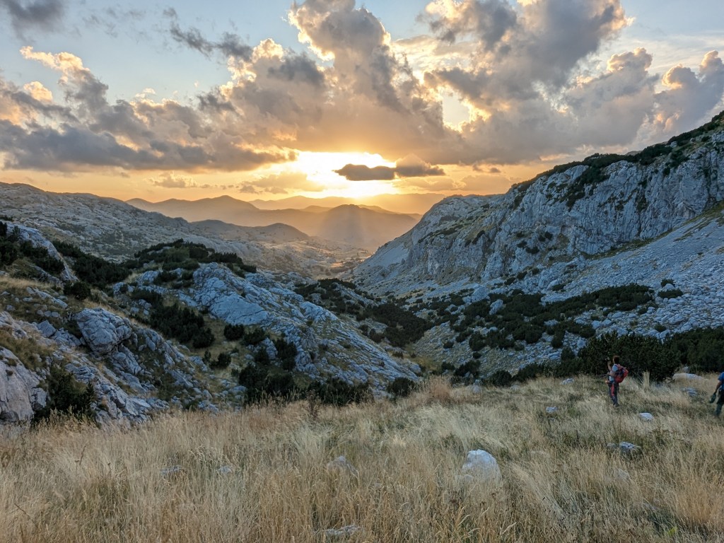 The route we took back had different scenery, there was a section of pine trees that was absolutely lovely and then we dropped into a ravine where some wild mountain goats lept across the field and up the cliffside right as the sun was setting. A truly magical moment and the first time my friends had seen a herd of the goats! A splash of orange blurred the sky and broke through the clouds which brightened up the field we were walking through and the sides of the white rocky mountains along the ravine. Shear beauty surrounded us making it easy to forget that it was actually getting late, we were still far away, low on water and legs were tired. But for those few minutes we enjoyed before the sun disappeared below the horizon.
