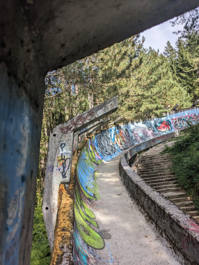 I was very excited to learn that the ruined bobsled track had street art and graffiti painted on it and that you can now walk the track!!!