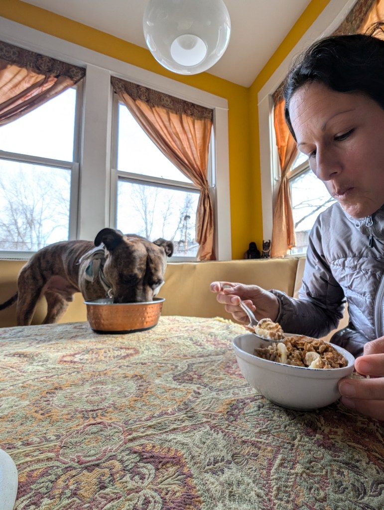 Hojo – On my last sit I had a dog that wanted to be near me all the time and wanted a lot of attention. He was allowed on all furniture so when it came time to eat he sat right next to me at the table too. Since he is a dog and loves food he couldn´t quite figure out personal space so I decided to bring his food bowl up to the table too. It was perfect, all he really wanted was to join the meal with me. He ate in peace at my side, almost taking a bite every time I did. This arrangement stopped him trying to sniff my food which made eating easier!