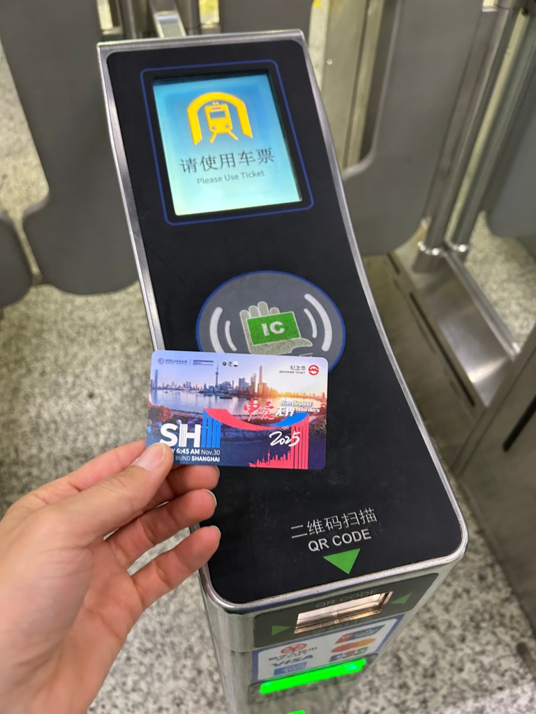 The race gave a subway card (2 trips) so I got up early and headed to the nearest station by bike (10 min ride…there are tons of bikes everywhere in Shanghai to use with the local apps…40 cents for 30 min…best option, I swear!) with my friends husband who was curious how such a big race start would be and to maybe absorb from me (who they considered pro) how I prepared. We left 1.5 hours before corral D start time and that was plenty of time for everything pre race!